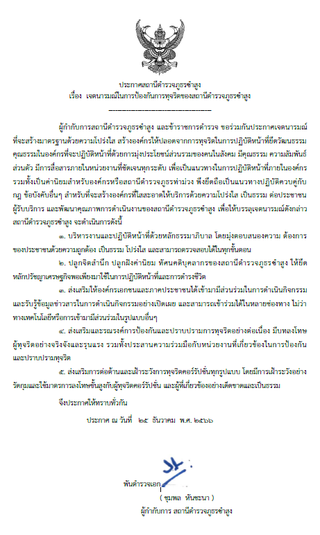 ข่าวฝากประชาสัมพันธ์ 03 25 ธ.ค. 2566 โดย admin / ข่าวประชาสัมพันธ์,ข่าวฝากประชาสัมพันธ์ เมื่อวันที่ 25 ธ.ค.2566 เวลา 10.00 น. พ.ต.อ.ชุมพล หันชะนา ผกก.สภ.ซำสูง ประกาศเจตนารมณ์ของหน่วยงาน ประกาศเจตนารมณ์ ในการป้องกันและต่อต้านการทุจริตชองสถานี และประกาศ เจตนารมณ์ไม่รับของขวัญ และสินบนอื่นใด ทุกชนิดจากการปฏิบัติหน้าที่ ในหน่วยงาน Facebook iconFacebookTwitter iconTwitterLINE iconLine